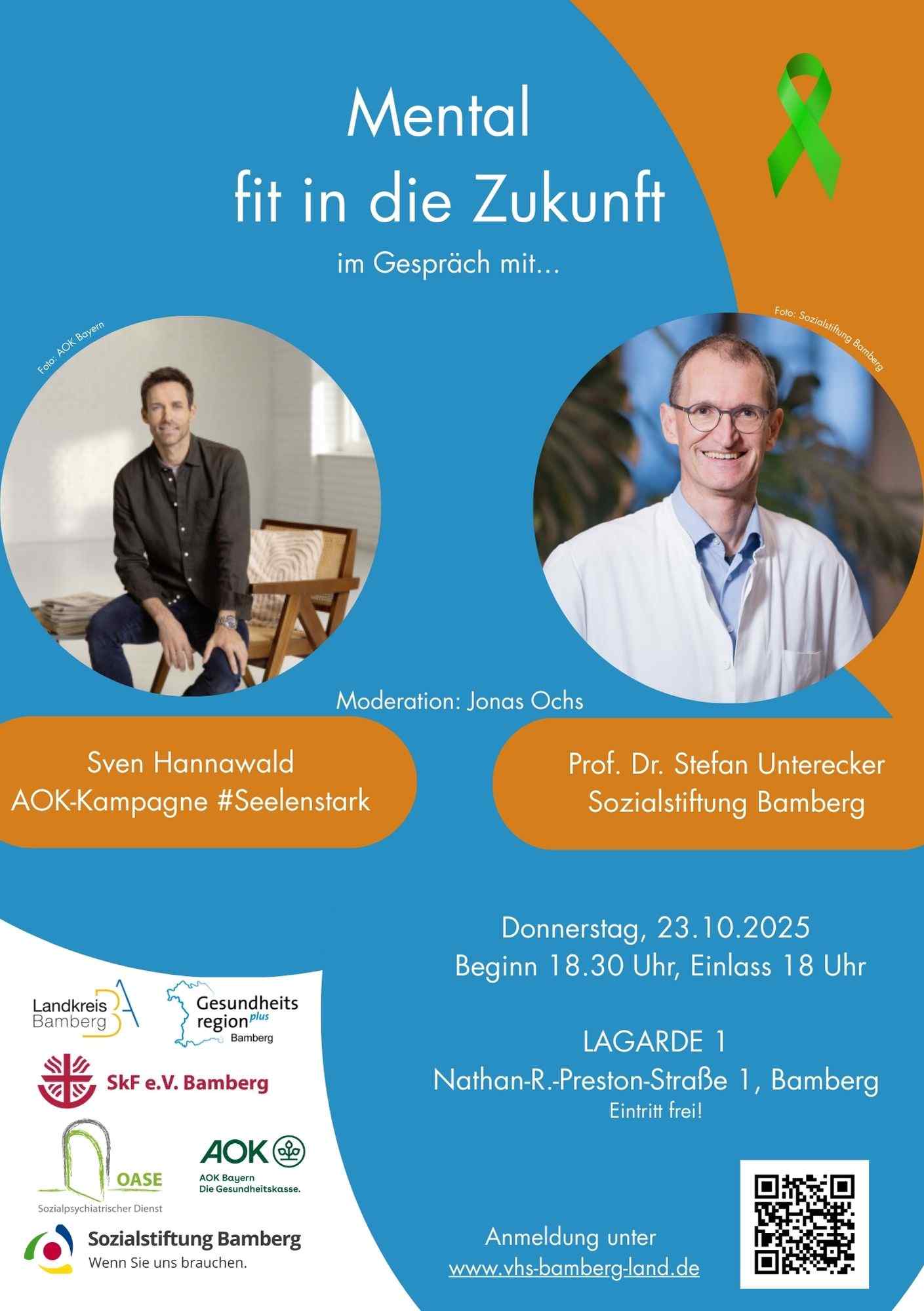 ![]() Anlässlich des Aktionsmonats zur seelischen Gesundheit findet die Veranstaltung „Mental fit in die Zukunft“ mit Prof. Dr. med. Stefan Unterecker, Chefarzt der Klinik für Psychiatrie und Psychotherapie in Bamberg und Sven Hannawald, Skisprunglegende und Gesicht der AOK-Kampagne #Seelenstark, statt. |