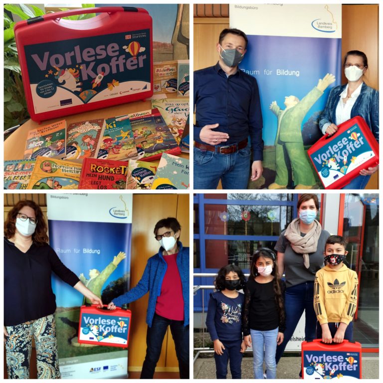 Zum Welttag des Buches übergibt das Bildungsbüro im Landkreis Bamberg Vorlesekoffer an das Mehrgenerationenhaus Strullendorf und den Kinderhort Löwenzahn in Gundelsheim Der Vorlesekoffer ist ein Koffer voller Geschichten und Bücher, die sich besonders gut vorlesen lassen. Gemeinsam mit der Deutsche Bahn Stiftung stattet die Stiftung Lesen in diesem Jahr wieder