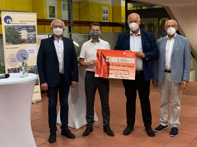Die MENTOR-Leseförderung im Landkreis Bamberg erhält eine großzügige Anschubfinanzierung durch die Stiftung „Helfen tut gut“. Hirschaids Bürgermeister Klaus Homann, zweiter Vorsitzender des Vereins MENTOR – Die Leselernhelfer Landkreis Bamberg e.V., und Vorstand Dr. Christian Lorenz nahmen den symbolischen Scheck in der Realschule Hirschaid entgegen. Der frühere Landrat Dr. Günther Denzler