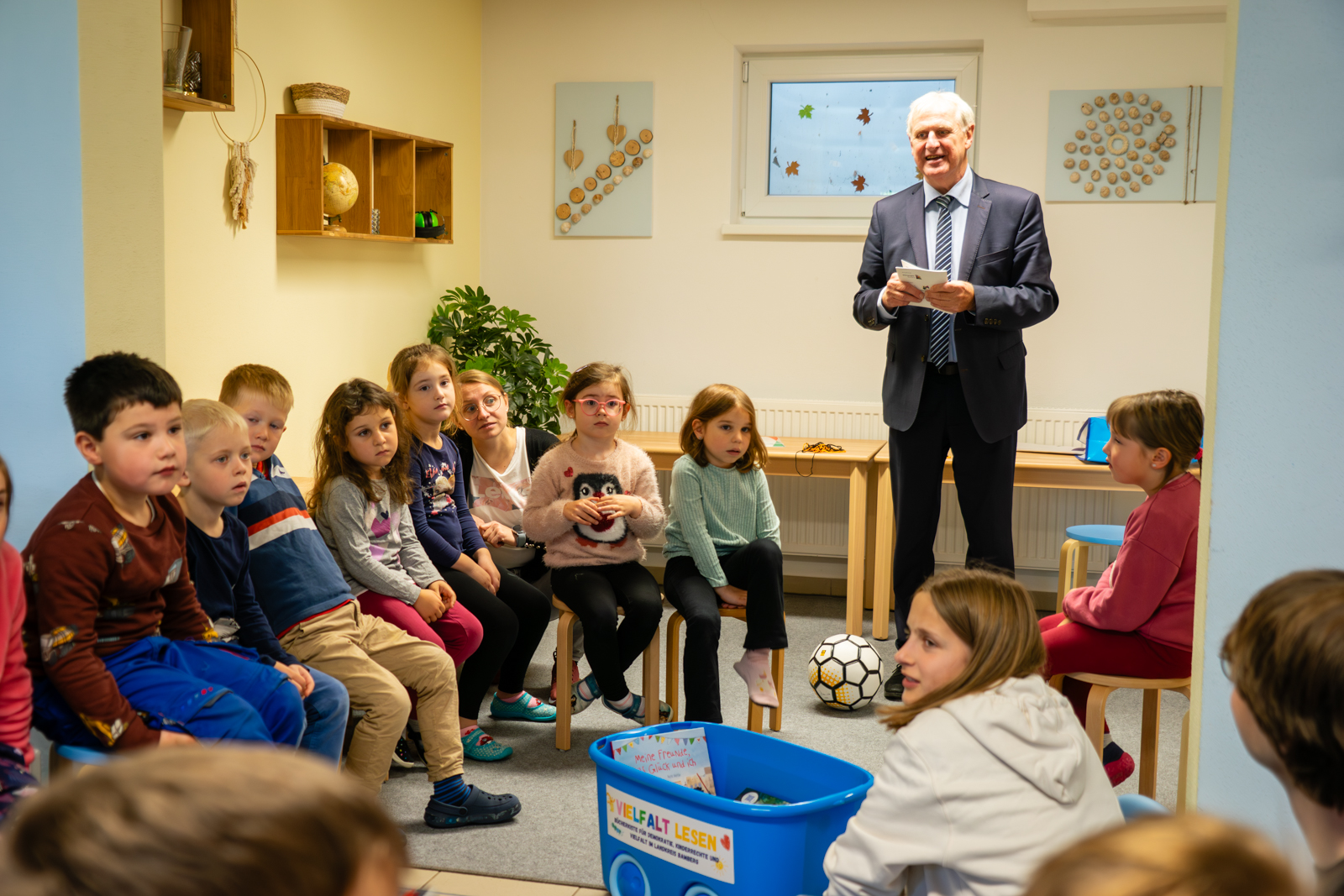 Große Freude im Haus für Kinder St. Jakobus in Königsfeld: Die Kinder aus der Gruppe der „Großen Bären“ stürzten sich begeistert auf die bunten Bücher, blätterten neugierig darin und ließen sich vorlesen. Anlass war die Übergabe der ersten Bücherkisten zum Thema „Vielfalt lesen“, zu der der stellvertretende Landrat Bruno Kellner, Jugendkreisrätin Annika Lieb, Kreisjugendamtsleiter Tobias Dusold sowie Markus Bria und Dr. Christian Lorenz aus dem Bildungsbüro vor Ort waren.