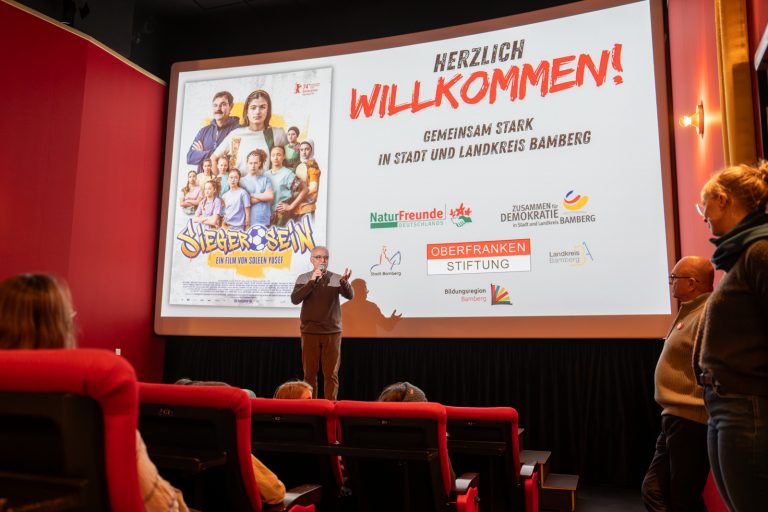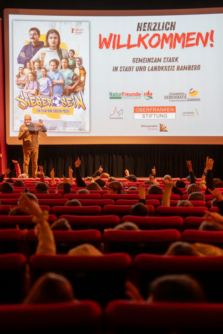 Drei Tage lang war der Kinosaal im Odeon voll besetzt: Mit dem Projekt „Gemeinsam stark – in Stadt und Landkreis Bamberg“ setzten Stadt und Landkreis Bamberg gemeinsam ein deutliches Zeichen für Demokratie, Respekt und Zusammenhalt. Gezeigt wurde der Film „Sieger sein“ von Regisseurin Soleen Yusef – ergänzt durch eine moderierte Diskussionsrunde mit dem interkulturellen Trainer und Autor Nevfel Cumart. Eingeladen waren Schülerinnen und Schüler der 6. Jahrgangsstufe aus Stadt und Landkreis Bamberg.
