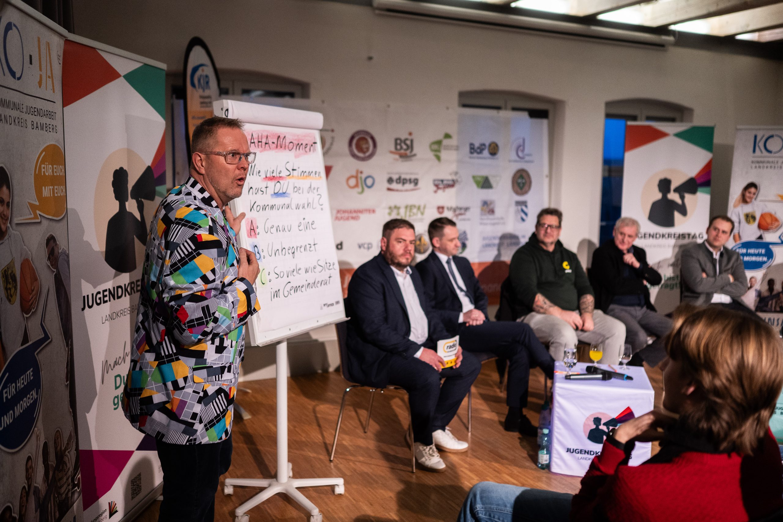 Auf dem Podium diskutierten Johannes Maciejonczyk (CSU), Bruno Kellner (FREIE WÄHLER-ÜWG), Thomas Ochs (GRÜNE), Florian Köhler (AfD) und Alexander Graf (Die Linke). Schon vor Beginn der eigentlichen Debatte erhielten die Jugendlichen eine Einführung in das Wahlsystem durch den Kreisjugendpfleger Oliver Schulz-Mayr – ein bewusster Baustein politischer Bildung, mit dem der Jugendkreistag Hemmschwellen abbauen wollte.
