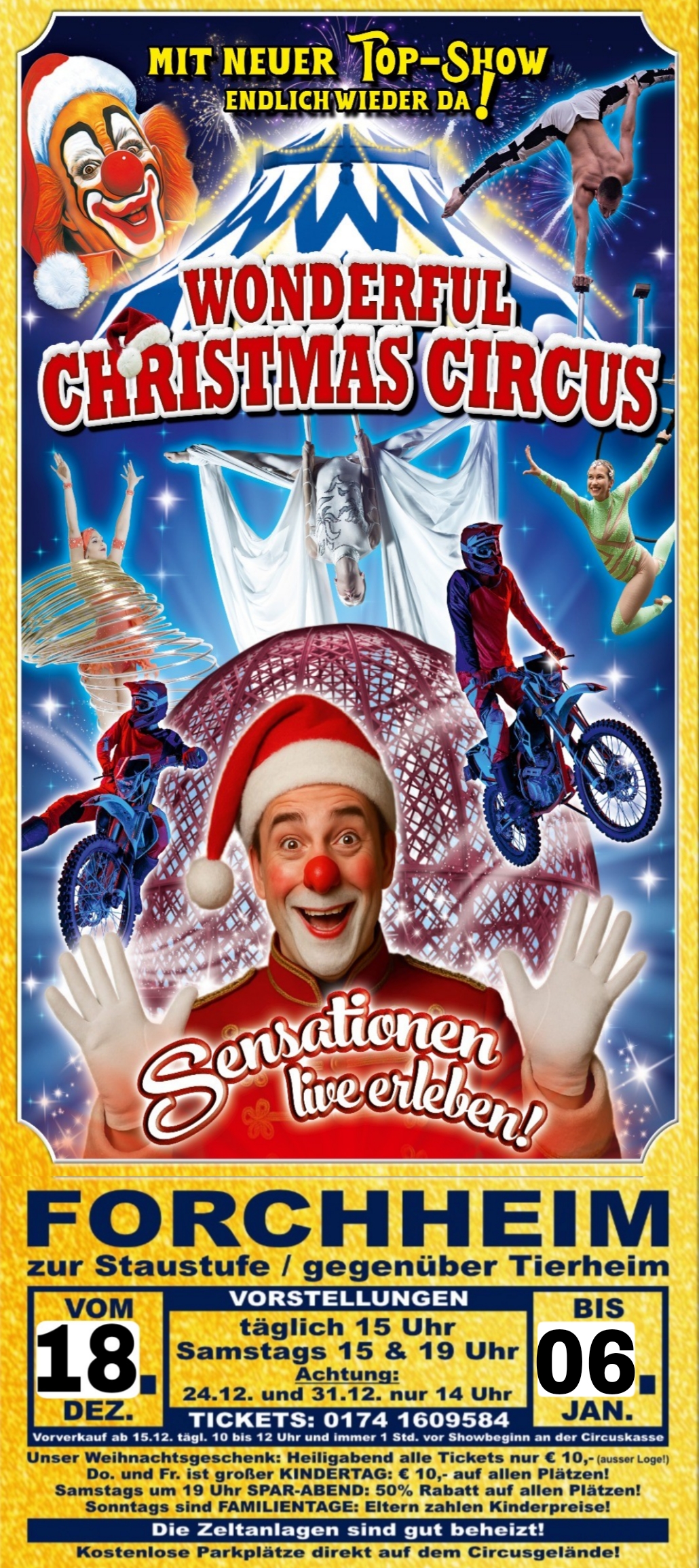 Zur Staustufe 36, 91301 Forchheim Zur Staustufe 36, Forchheim, DeutschlandManege frei für das weihnachtliche Zirkuserlebnis der Extraklasse! Der Wonderful Christmas Circus kehrt bereits zum sechsten Mal nach Forchheim zurück und verwandelt den Platz zur Staufstufe 36 (gegenüber dem Tierheim) in eine funkelnde Welt aus Magie, Nervenkitzel und festlicher Stimmung.