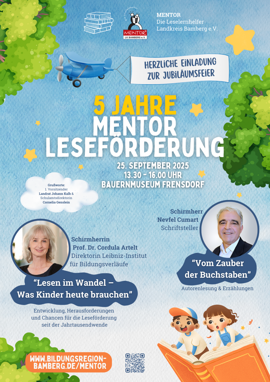 MENTOR im Landkreis Bamberg wird 5 Jahre alt. Wir feiern dies mit zwei Festvorträgen unserer Schirmherrin und unseres Schirmherren. Prof. Dr. Cordula Artelt, Direktorin des Leibniz-Instituts für Bildungsverläufe in Bamberg, wird einen empirischen Blick auf das Thema „Lesen im Wandel – Was Kinder heute brauchen“ werfen. Schriftsteller Nevfel Cumart bietet anschließend eine Autorenlesung unter dem Titel „Vom Zauber der Buchstaben“.
